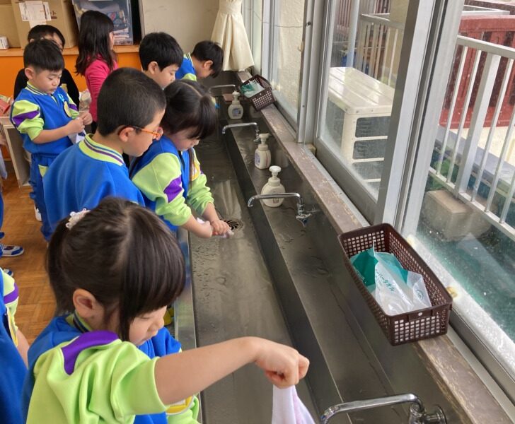3学期から、給食で自分のおしぼりを使うようになり、自分でしぼることを頑張っています!力を入れてしぼるところが難しそうですが、何回か繰り返すうちに上手になってきましたよ✨年長さんに向けていろいろなことに挑戦中の子どもたちです!!