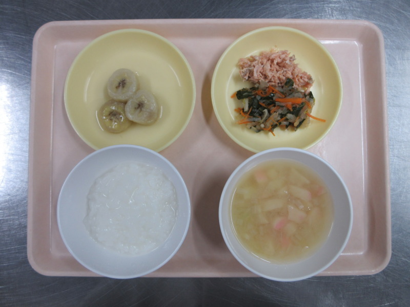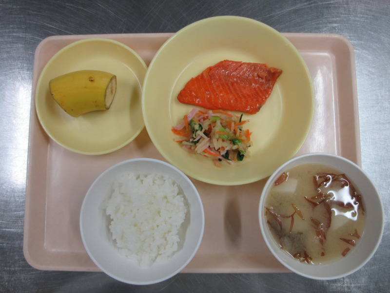鮭塩焼き 今日の給食は、ごはん、鮭の塩焼き、切干大根和え、みそ汁、バナナです。 冬休みが終わり、野菜が苦手な子もスープや和え物も残さず食べれるようになってきました!年少さんもごはんを食べれるようになってきましたね♪ 離乳食(後期)の給食は、米がゆ、みそ汁、煮魚(鮭)、切干大根煮、バナナです。