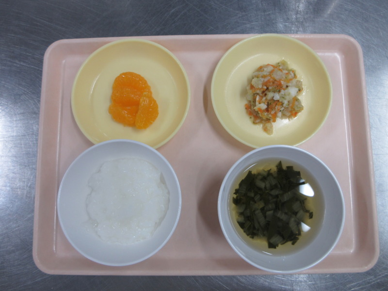 離乳食(後期)の給食は、米がゆ、すまし汁、カレイのみそ野菜煮、みかんです。