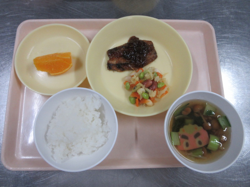 今日の給食は、ごはん、いわしの蒲焼き、まめまめサラダ、すまし汁、オレンジです。