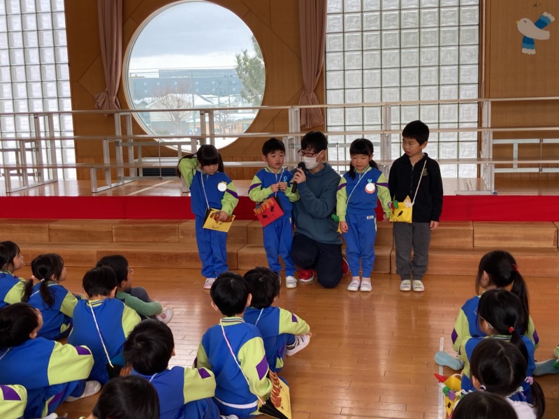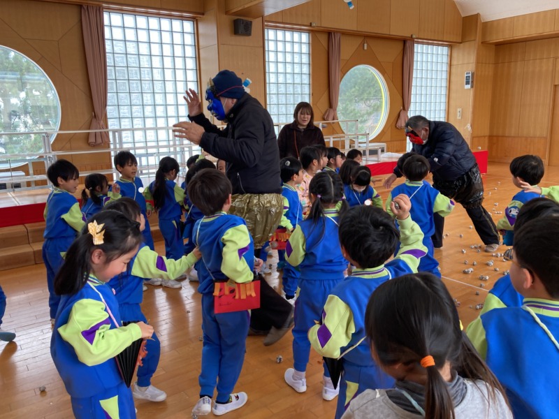 2月3日(火)の節分集会で「豆まき」の歌を歌ったり、どんな鬼をやっつけたいかを発表したりしました。鬼が現れると、泣き虫鬼や怒りんぼ鬼など自分の心の中にいる鬼を退治できるように「鬼は~外、福は~内!」と大きな声を出して新聞紙で作った豆を投げていましたよ。ちょっぴり怖かったけど無事に鬼を退治することができて満足気な年中さんでした♪