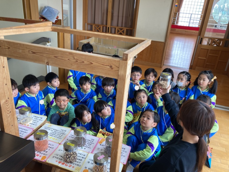 「まめまめコーナー」でいろいろな豆を見ました。節分の時に使う大豆だけでなく、小豆やひよこ豆などたくさんの種類があることにびっくり!「ちっちゃいつぶつぶだ~」「あんこって小豆からできるの?」と違いを比べたり、作られるものに感心したり興味をもって見ていましたよ。