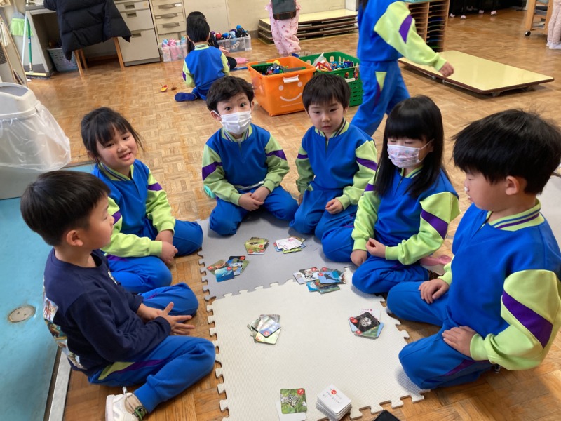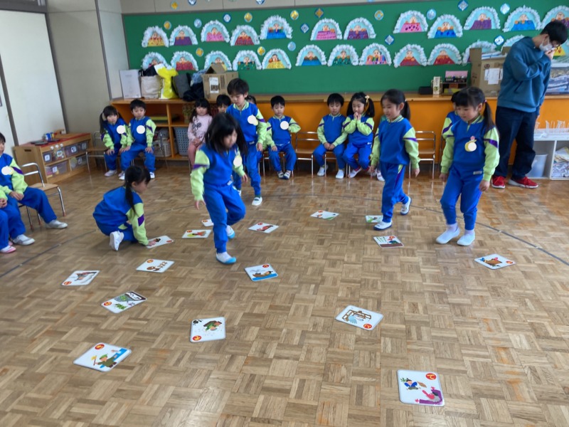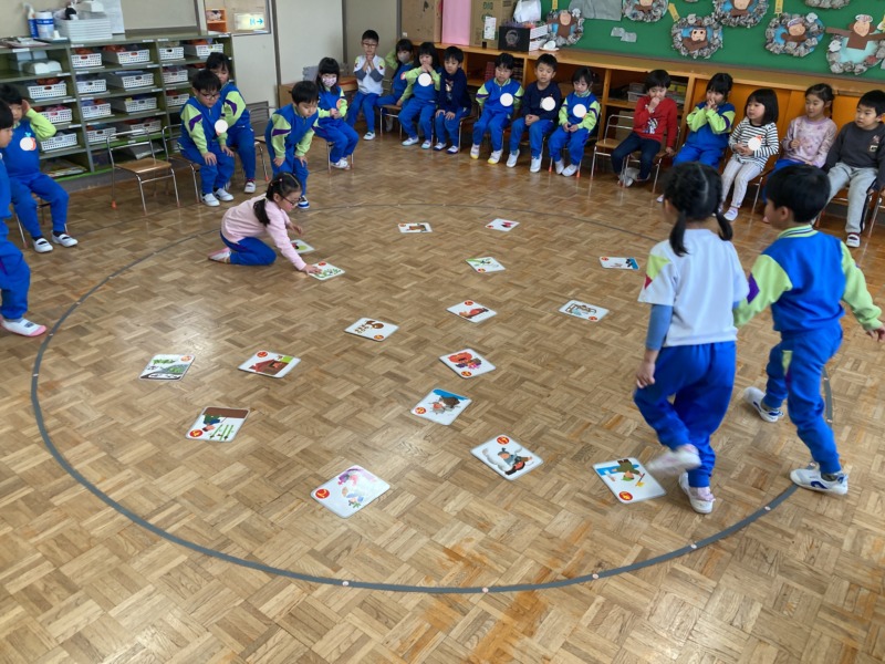 かるた遊びにも慣れてきたので、グループ対抗で大型かるたを遊びました。負けないようによく聞いて素早く取りに行ったり、お友達を一生懸命応援したり大盛り上がりで楽しんでいましたよ。
