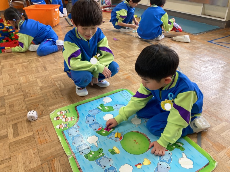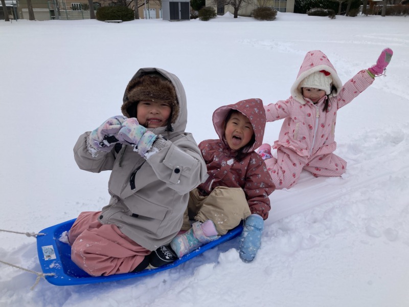 お部屋ではお店屋さんやすごろく、かるたを楽しんでいます。お店屋さんではお客さんとのやり取りを楽しみながら、閉店した後に椅子を下げたりテーブルを拭いたり本格的な遊びになってきました。外では沼田公園に出掛けて雪遊びを楽しんでいます。大きな雪だるまを作って葉っぱや木の棒で顔を作ったり、そり遊びをしたり思い思いの遊びでたくさん体を動かしていますよ😁