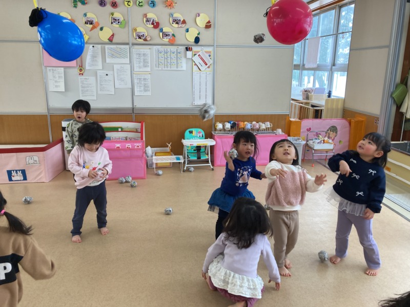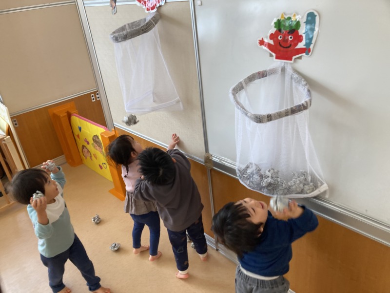 前日は本番に向けて、鬼の顔がついた風船に丸めた新聞紙を当てたり、鬼の的当てや玉入れをしたりして楽しみました。お部屋中に「おにはそと~ふくはうち~」の元気な声が響き渡っていましたよ。