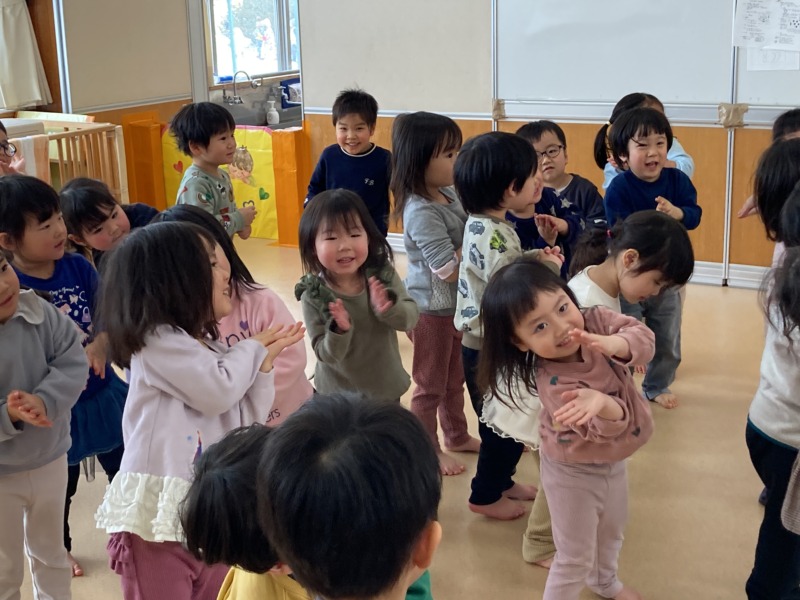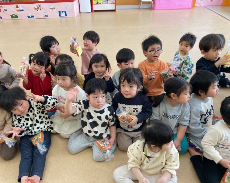 当日は“まめまき“の歌を楽しく歌い、節分のシアターを見て行事に親しみました。そして、大きい鬼のイラストに少しドキドキしながら、鬼のついたてに向かって「おにはそとー」と一生懸命豆まきをしましたよ!途中で鬼が登場すると驚き、保育者の足にしがみつく子どもたち。保育者と一緒に鬼退治をし、最後にはお土産をもらって嬉しそうな表情を見せてくれました♡