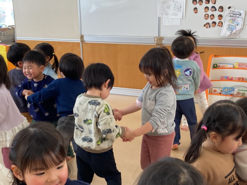 音楽に合わせて体を揺らし、お友達と一緒に手を繋いで笑顔で踊っていました🎶