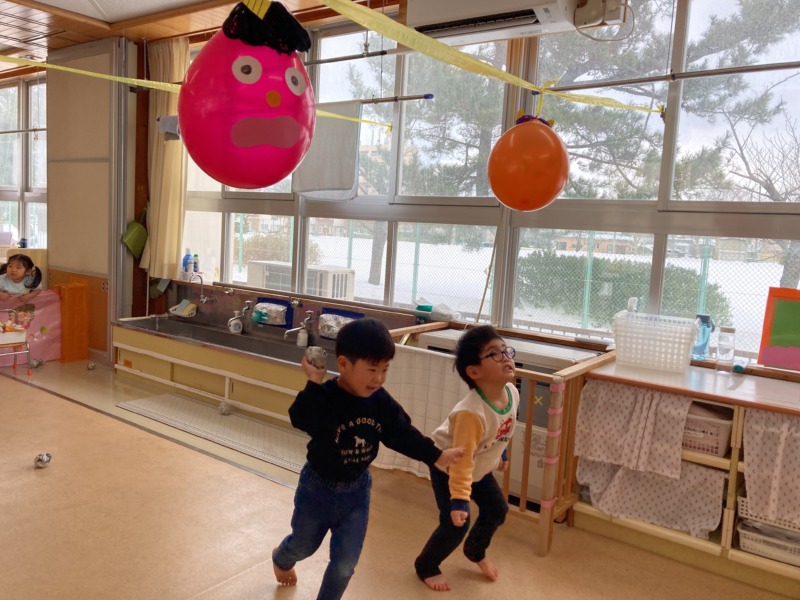 前日は本番に向けて、鬼の顔がついた風船に丸めた新聞紙を当てたり、鬼の的当てや玉入れをしたりして楽しみました。お部屋中に「おにはそと~ふくはうち~」の元気な声が響き渡っていましたよ。