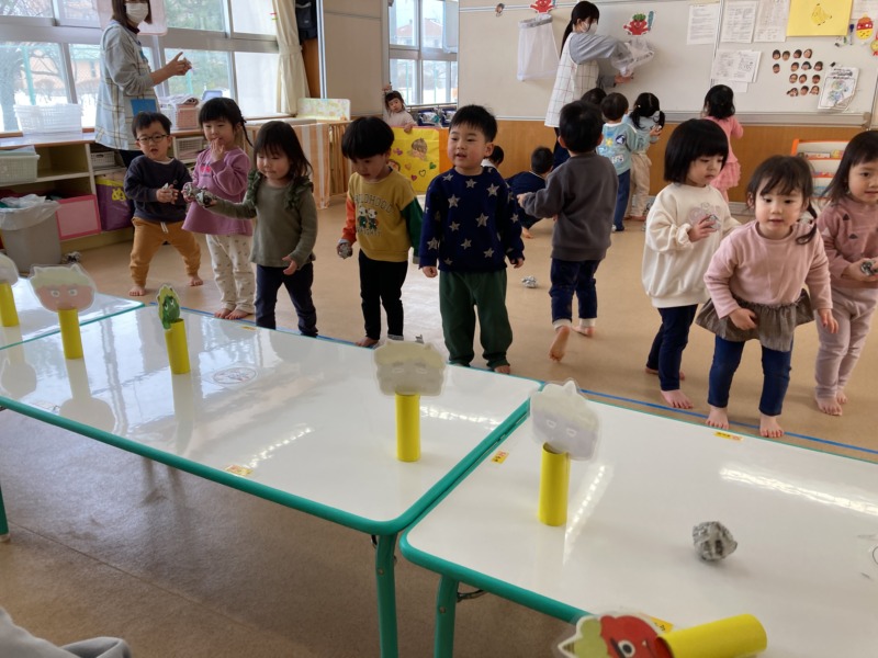 「えーんえーんしてる鬼に当てたい!」と鬼の表情を見て、退治したい鬼を自分で選ぶ姿も見られ、当たると「やったー!」と嬉しそうな声をあげていました!