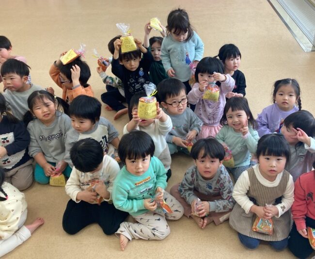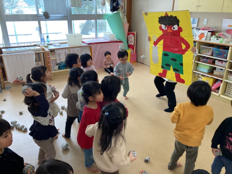 当日は“まめまき“の歌を楽しく歌い、節分のシアターを見て行事に親しみました。そして、大きい鬼のイラストに少しドキドキしながら、鬼のついたてに向かって「おにはそとー」と一生懸命豆まきをしましたよ!途中で鬼が登場すると驚き、保育者の足にしがみつく子どもたち。保育者と一緒に鬼退治をし、最後にはお土産をもらって嬉しそうな表情を見せてくれました♡