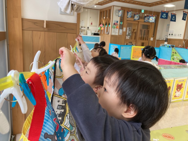 手先がうまく使えるようになってきたひよこ1くみさん。洗濯物を干したり、「かわいたよー!」と洗濯物を取り込んでくれたりと楽しんでいました。お絵描きもとっても上手です♡
