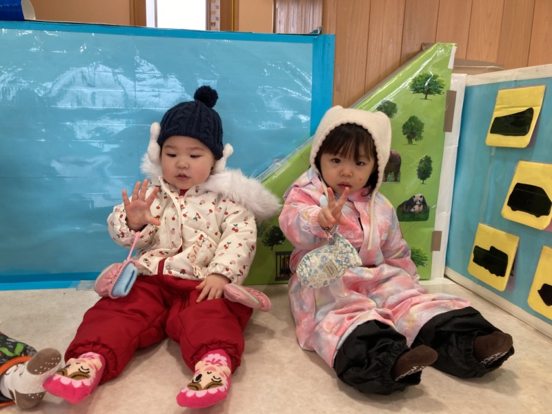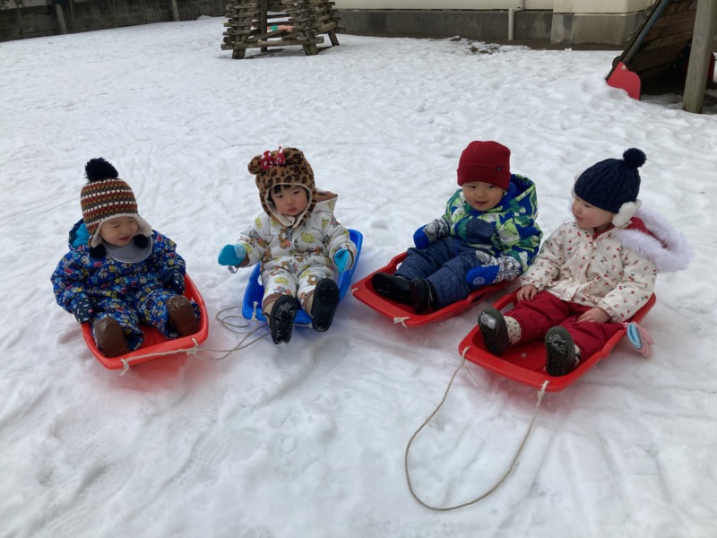最後の雪遊び。そりに乗ったり、走ったり、久しぶりの外遊びを楽しみました!先生の「はい、ポーズ!」の掛け声に合わせてピースをするなど、可愛い顔を見せてくれましたよ♡
