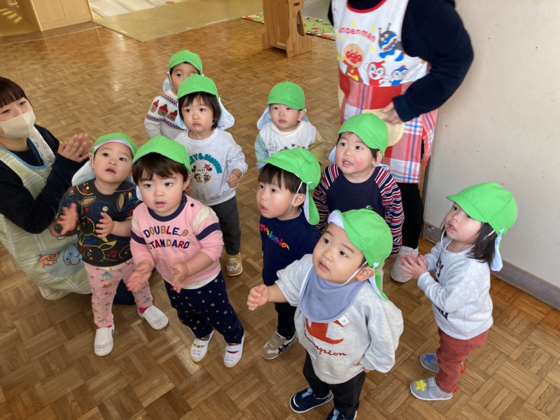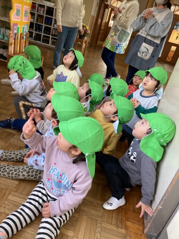 年長さんの音楽会の練習を覗きに行ってきました♪年長さんの真剣な表情で頑張る姿を見て、ひよこくみさんも「しーだよ」とお互いでお話をしながら、夢中で見ていました!