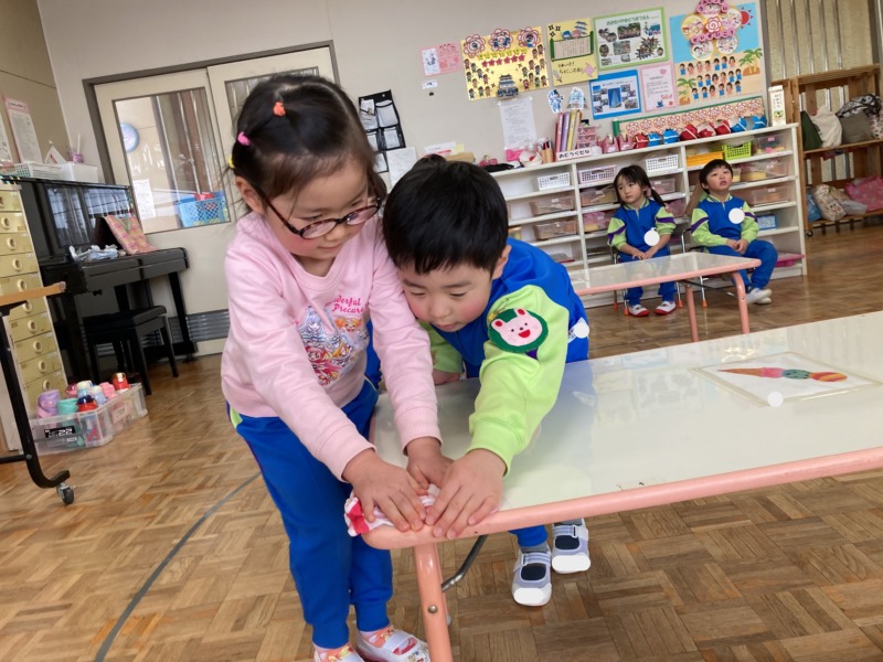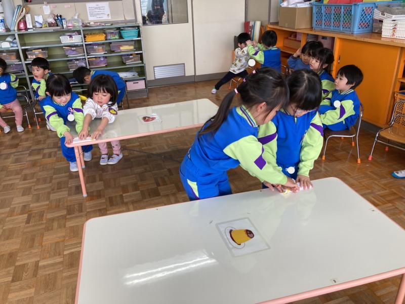 先日、年中のお兄さん・お姉さんに優しくテーブルの拭き方を教えてもらいました!