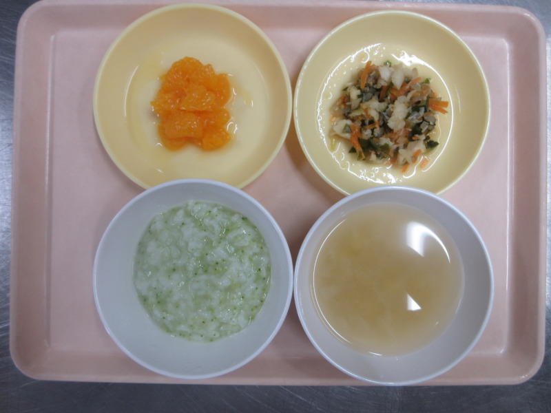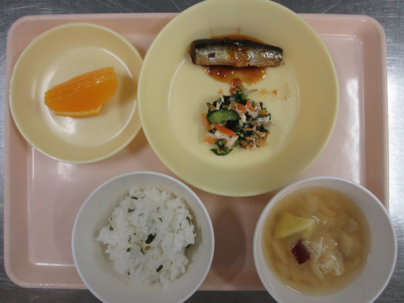イワシ甘露煮 今日の給食は、青菜ごはん、イワシ甘露煮、バンバンジーサラダ、みそ汁、オレンジです。 みそ汁に入ったさつま芋がとっても甘く、みんなおかわりして食べていました! 青菜ごはんも喜んで食べていました♪ 離乳食(後期)の給食は、ブロッコリーがゆ、みそ汁、カレイと野菜のうま煮、みかんです。