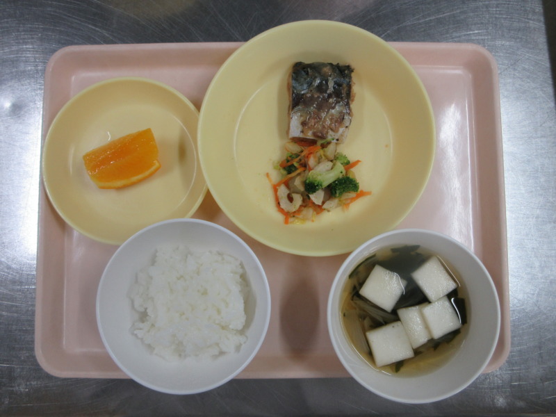 さばの味噌煮 今日の給食は、ごはん、さばの味噌煮、おかか和え、すまし汁、オレンジです。 さばの味噌煮とごはんがよく合い、おかわりしてよく食べていました♪ 離乳食(後期)の給食は、米がゆ、すまし汁、鮭のみそ煮、おかか和え、みかんです。