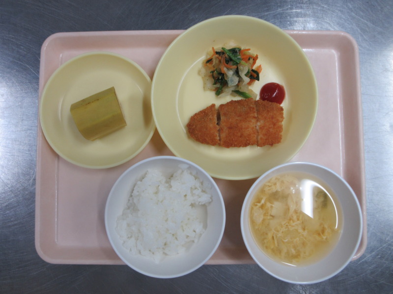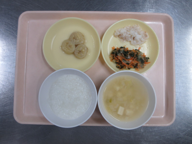 名称未設定 今日の給食は、ごはん、白身魚フライ、ごま和え、かきたま汁、バナナです。 甘めの味付けのごま和えは食べやすく、野菜が苦手な子も残さず食べていました。魚フライもサクサクで「おいし~」と言って食べていましたよ♪ 離乳食(後期)の給食は、米がゆ、みそ汁、煮魚(カレイ)、煮浸し、バナナです。