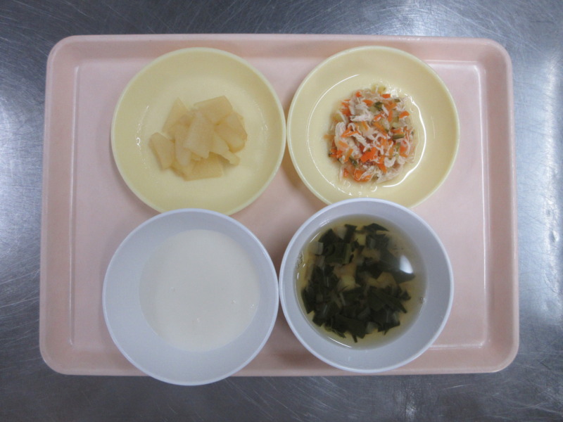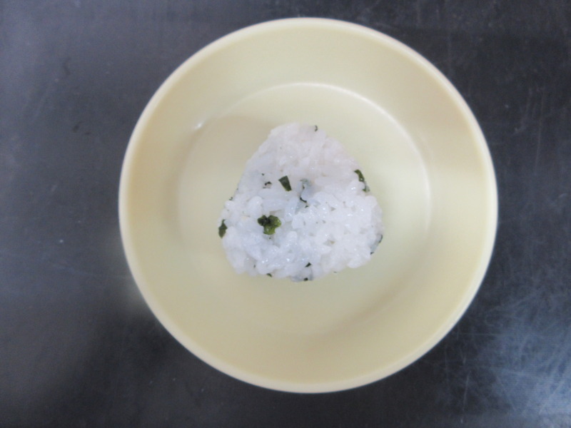 チーズオムレツ 今日の給食は、バターロール(いちご&マーガリン)、チーズオムレツ、ハムサラダ、ポテトスープ、りんごゼリー、牛乳です。 チーズオムレツ「おいし~」と言ってよく食べていました。じゃが芋が入ったスープも人気でしたよ♪ 離乳食(後期)の給食は、パンがゆ、スープ、鶏肉と野菜のうま煮、りんごです。 保育園の手作りおやつはわかめおにぎりです。