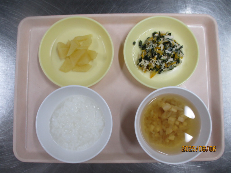 離乳食(後期)の給食は、おかゆ、スープ、鶏肉と野菜のうま煮、りんごです。