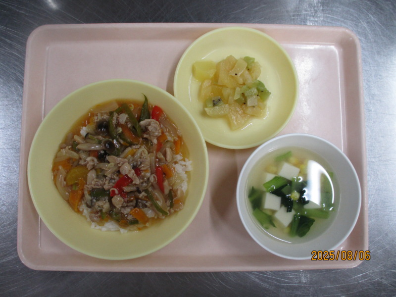 今日の給食は、チンジャオロース丼、ミックスフルーツ、豆腐のスープです。