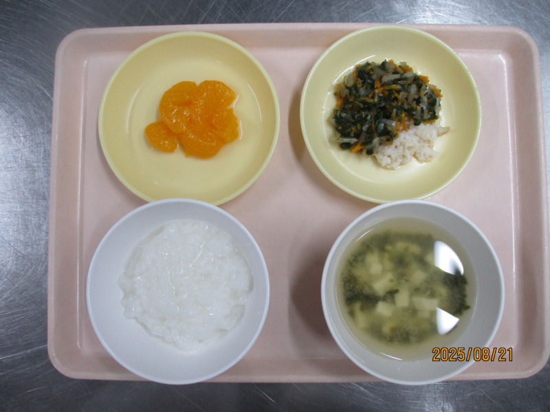 離乳食(後期)の給食は、おかゆ、みそ汁、カレイと野菜のみぞれあん、みかんです。