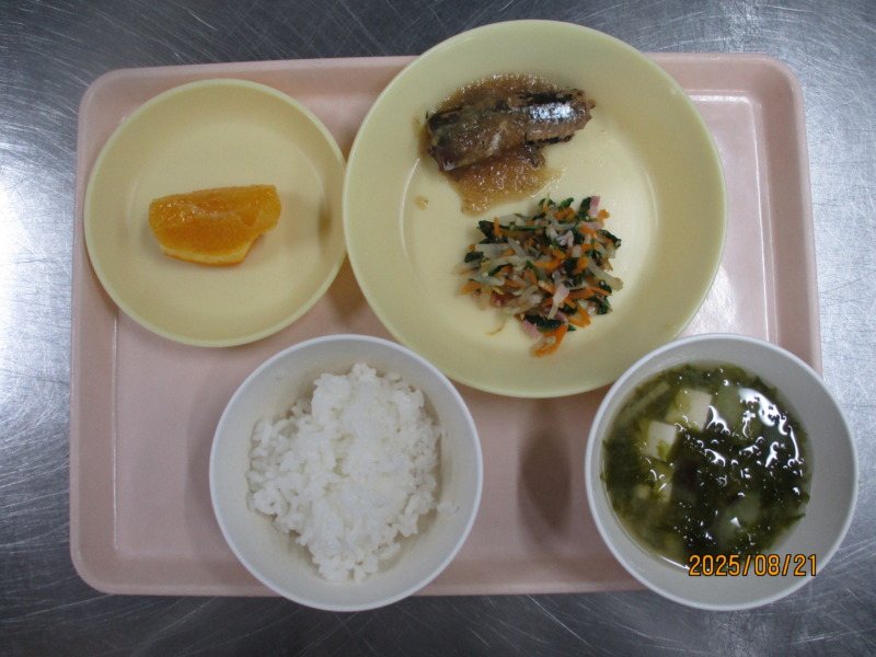 今日の給食は、ごはん、サンマみぞれ煮、ベーコンナムル、オレンジ、みそ汁です。