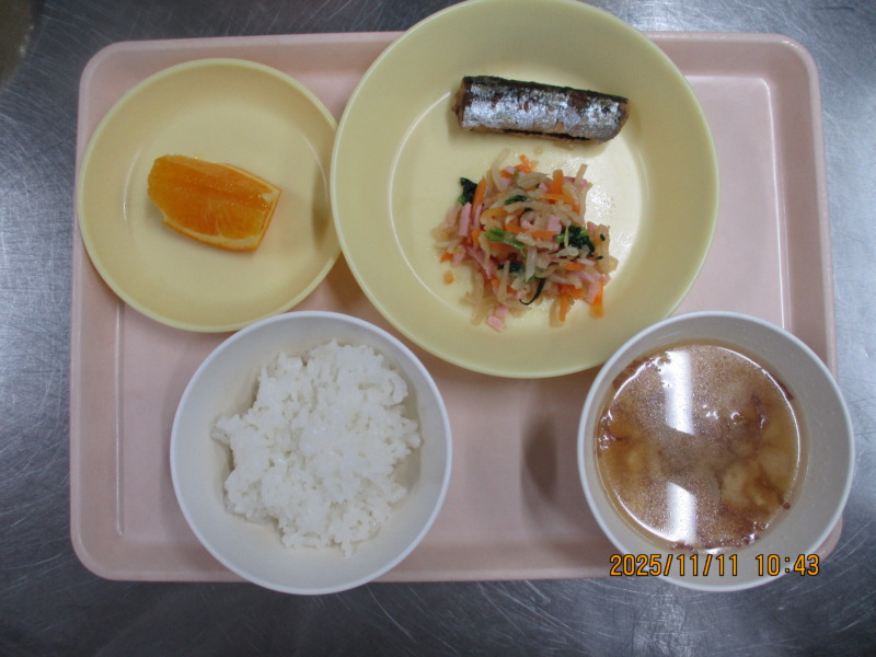今日の給食は、ごはん、みそ汁、サンマみぞれ煮、切干大根和え、オレンジです。