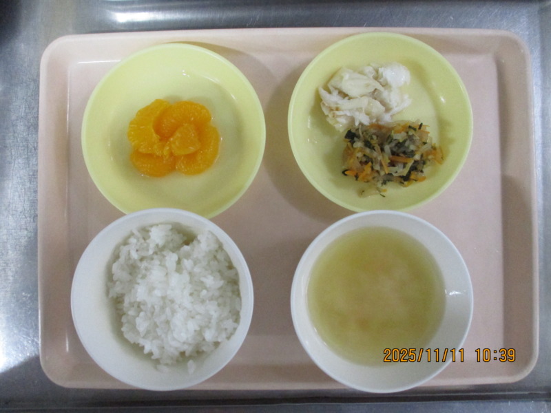 離乳食(後期)の給食は、おかゆ、みそ汁、煮魚(カレイ)、切干大根煮、みかんです。