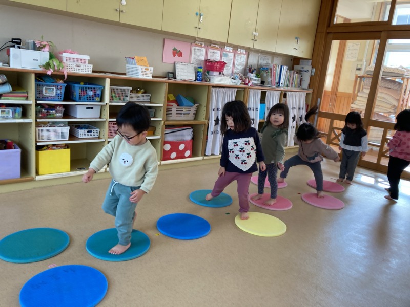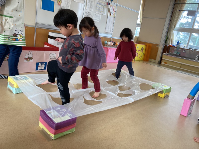 4月に比べ、ジャンプをしたり、片足で立ったりと、バランス感覚が身に付いてきた子どもたち。プラポンを使ってけんけんぱをしたり、穴が開いたビニールの仕掛けをそ~っとまたいで遊んだり…はじめは慎重な子どもたちも、最後には、“穴なんて!”と豪快に走り去って行く姿には笑ってしまいました😆